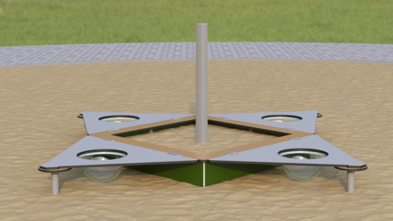 Песочница соответствует требованиям ГОСТ Р 52169-2012 по безопасности. Крышки защищают песок от загрязнений и могут использоваться как игровые столики. Прозрачные полусферы стимулируют любознательность детей. Конструкция способствует развитию моторики, социальных навыков и творческого мышления. Высота свободного падения — 218 мм. Модель подходит для детских садов, парков и дворовых территорий.