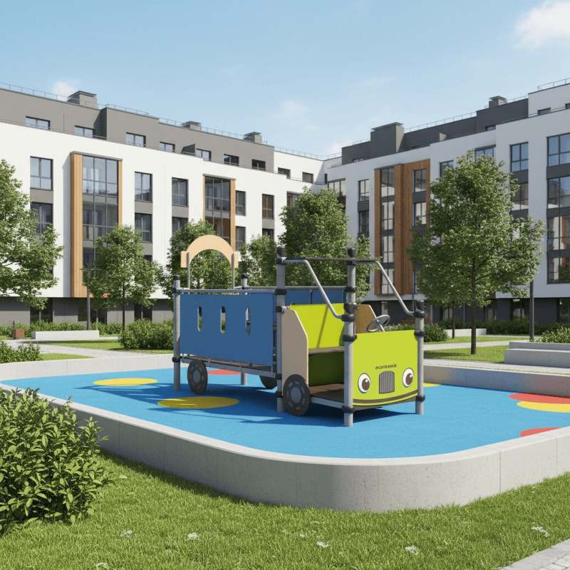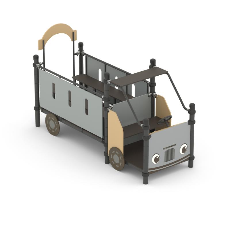 Изделие из шести стоек, между первой и второй парой стоек расположена кабина Микроавтобуса, между второй и третьей парой стоек - отсек с сидениями и ограждениями. Кабина состоит из стоек, к которым крепится крыша, пол кабины, посадочное место со спинкой. К первой паре стоек крепится передняя панель с рулем и декоративными фарами. К боковым панелям кабины крепится декоративное колесо. Сзади кабины находится отсек с двумя боковыми ограждениями, входной аркой, полом, и двумя скамейками по бокам.