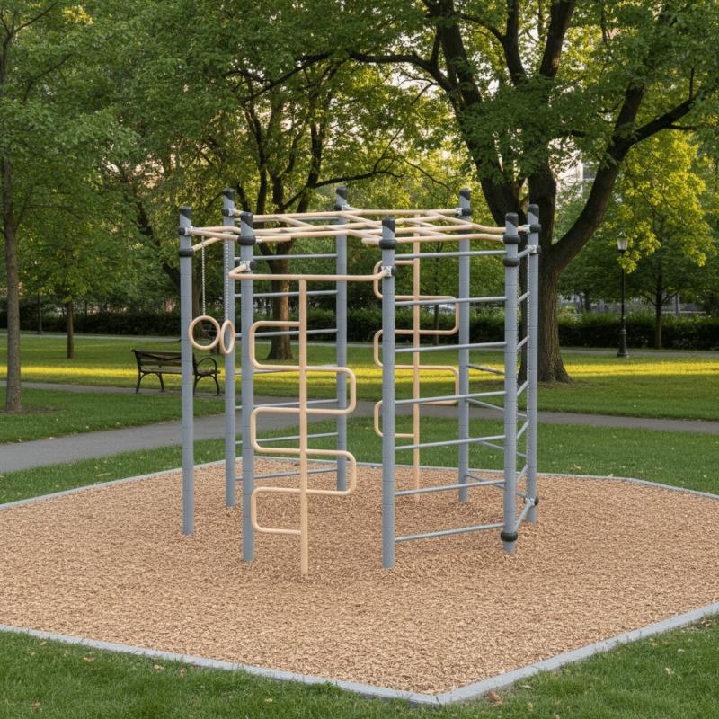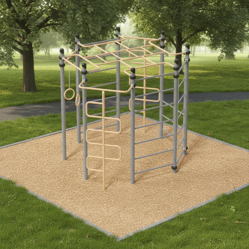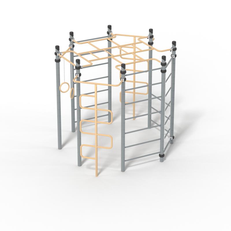 Спортивное оборудование предназначено для установки на территориях игровых зон, зон отдыха, спортивных площадках. Может эксплуатироваться круглогодично. Предназначено для доступных занятий физической культурой на свежем воздухе.Комплекс представляет собой сборно-разборную конструкцию прямоугольной формы, состоящую из восьми стоек, между которыми должны быть закреплены лаз-змейка, цепной однорядный лаз, лаз-скалолаз, кольца гимнастические, трехступенчатая лестница, семиступенчатая шведская стенка, два турника.Изделие устанавливается на открытых уличных участках, находящихся под контролем ответственного лица – эксплуатанта. Установка должна проводится на ровной площадке, свободной от насаждений. В зоне безопасности должно быть ударопоглощающее покрытие (песок, древесные опилки) минимальной толщиной 300 мм.