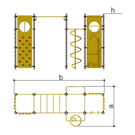 Спортивное оборудование предназначено для установки на территориях игровых зон, зон отдыха, спортивных площадках. Может эксплуатироваться круглогодично. Предназначено для доступных занятий физической культурой на свежем воздухе.Представляет собой сборно-разборную конструкцию прямоугольной формы, состоящую из восьми стоек, между которыми должны быть закреплены лаз-змейка, цепной однорядный лаз, лаз-скалолаз, кольца гимнастические, трехступенчатая лестница, семиступенчатая шведская стенка, два турника.Изделие устанавливается на открытых уличных участках, находящихся под контролем ответственного лица – эксплуатанта. Установка должна проводится на ровной площадке, свободной от насаждений. В зоне безопасности должно быть ударопоглощающее покрытие (песок, древесные опилки) минимальной толщиной 300 мм.