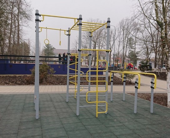 Спортивное оборудование предназначено для установки на территориях игровых зон, зон отдыха, спортивных площадках. Может эксплуатироваться круглогодично для пользователей от 7 до 14 лет. Предназначено для доступных занятий физической культурой на свежем воздухе.Представляет собой сборно-разборную конструкцию, состоящую из одной шестиступенчатой лестницы, двух четырехступенчатых лестниц, расположенных напротив друг друга, над которыми должен быть закреплен прямой рукоход, и одной стойки. Параллельно комплексу должны быть расположены спортивные брусья.Изделие устанавливается на открытых уличных участках, находящихся под контролем ответственного лица – эксплуатанта. Установка должна проводится на ровной площадке, свободной от насаждений. В зоне безопасности должно быть ударопоглощающее покрытие (песок, древесные опилки) минимальной толщиной 300 мм.