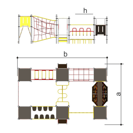 Спортивное оборудование для тематических игр и физического развития предназначено для детей в возрасте от 7 лет. Изделие представляет собой сборно-разборную каркасную конструкцию из металлических труб и фанерных элементов, установленную на забетонированные стойки.Изделие устанавливается на открытых уличных участках, находящихся под контролем ответственного лица – эксплуатанта. Установка должна проводится на ровной площадке, свободной от насаждений. В зоне безопасности должно быть ударопоглощающее покрытие (песок, древесные опилки) минимальной толщиной 300 мм.