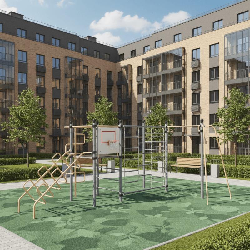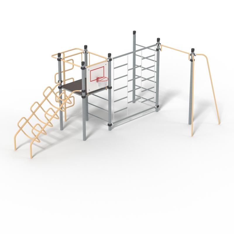 Спортивное оборудование предназначено для установки на территориях игровых зон, зон отдыха, спортивных площадках. Может эксплуатироваться круглогодично. Предназначено для доступных занятий физической культурой на свежем воздухе.Комплекс представляет собой сборно-разборную конструкцию прямоугольной формы, состоящую из восьми стоек, между которыми должны быть закреплены лаз-змейка, цепной однорядный лаз, лаз-скалолаз, кольца гимнастические, трехступенчатая лестница, семиступенчатая шведская стенка, два турника.Изделие устанавливается на открытых уличных участках, находящихся под контролем ответственного лица – эксплуатанта. Установка должна проводится на ровной площадке, свободной от насаждений. В зоне безопасности должно быть ударопоглощающее покрытие (песок, древесные опилки) минимальной толщиной 300 мм.