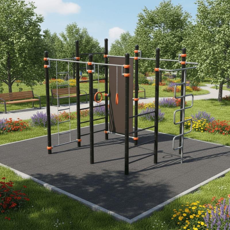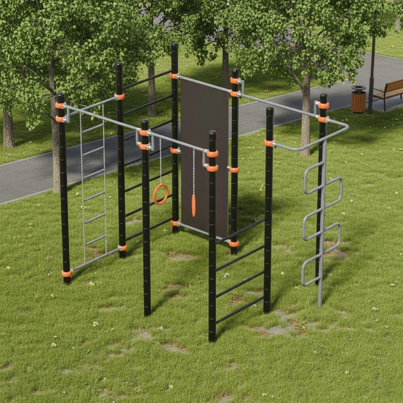 Спортивное оборудование предназначено для установки на территориях игровых зон, зон отдыха, спортивных площадках. Может эксплуатироваться круглогодично. Предназначено для доступных занятий физической культурой на свежем воздухе.Представляет собой сборно-разборную конструкцию прямоугольной формы, состоящую из восьми стоек, между которыми должны быть закреплены лаз-змейка, цепной однорядный лаз, лаз-скалолаз, кольца гимнастические, трехступенчатая лестница, семиступенчатая шведская стенка, два турника.Изделие устанавливается на открытых уличных участках, находящихся под контролем ответственного лица – эксплуатанта. Установка должна проводится на ровной площадке, свободной от насаждений. В зоне безопасности должно быть ударопоглощающее покрытие (песок, древесные опилки) минимальной толщиной 300 мм.