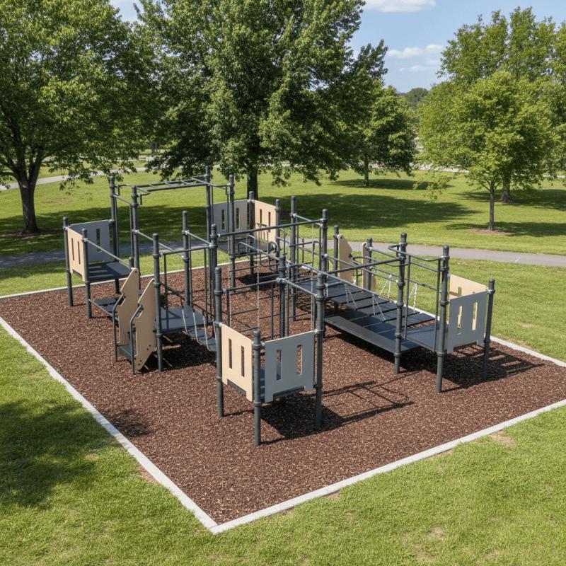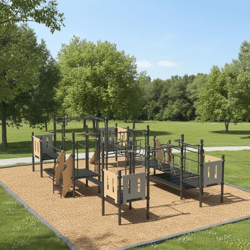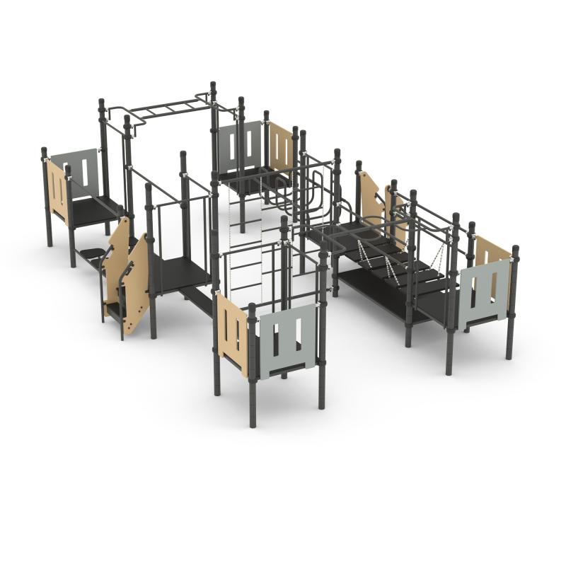 Спортивное оборудование для тематических игр и физического развития предназначено для детей в возрасте от 7 лет. Изделие представляет собой сборно-разборную каркасную конструкцию из металлических труб и фанерных элементов, установленную на забетонированные стойки.Изделие устанавливается на открытых уличных участках, находящихся под контролем ответственного лица – эксплуатанта. Установка должна проводится на ровной площадке, свободной от насаждений. В зоне безопасности должно быть ударопоглощающее покрытие (песок, древесные опилки) минимальной толщиной 300 мм.