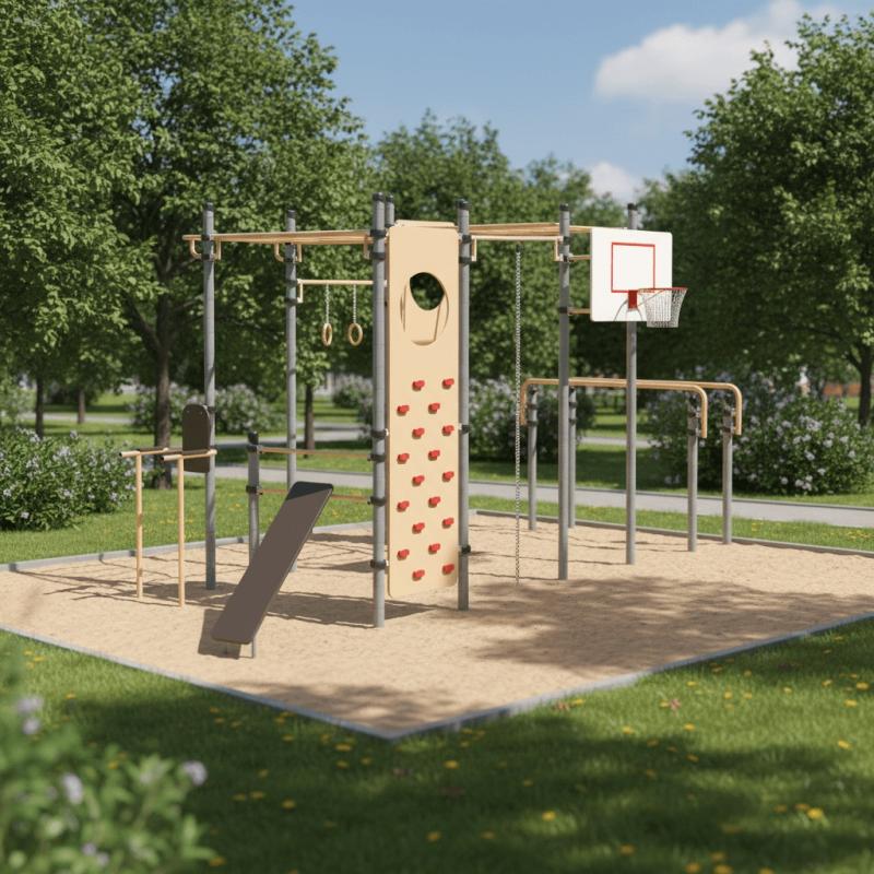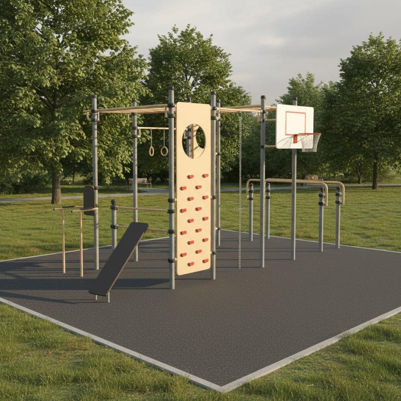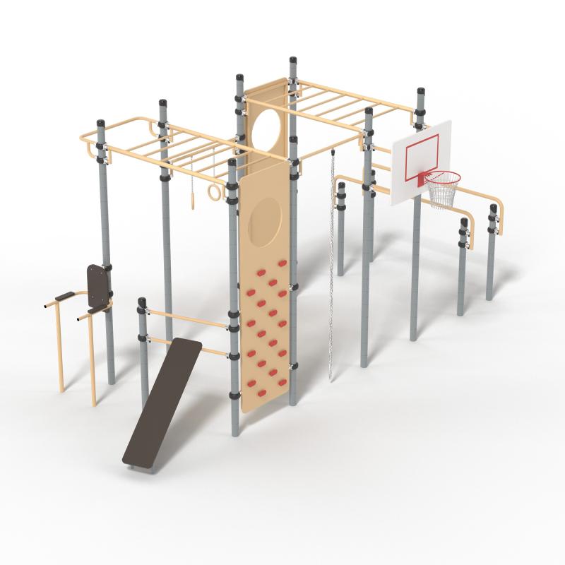 Спортивное оборудование предназначено для установки на территориях игровых зон, зон отдыха, спортивных площадках. Может эксплуатироваться круглогодично для пользователей от 7 до 14 лет. Предназначено для доступных занятий физической культурой на свежем воздухе.Представляет собой сборно-разборную конструкцию, состоящую из девяти стоек, между которыми должны быть закреплены турник, баскетбольный щит с кольцом и сеткой, одна пара брусьев с подлокотниками и спинкой, два скалолаза с закрепленными пластиковыми зацепами для удобства лазания и сквозной круглой мишенью для бросания мяча, канат с перекладиной, одна пара колец гимнастических с перекладиной, доска наклонная для качания пресса, два рукохода, расположенные сверху между стойками комплекса. В комплект комплекса входит также пара параллельных брусьев.Изделие устанавливается на открытых уличных участках, находящихся под контролем ответственного лица – эксплуатанта. Установка должна проводится на ровной площадке, свободной от насаждений. В зоне безопасности должно быть ударопоглощающее покрытие (песок, древесные опилки) минимальной толщиной 300 мм.