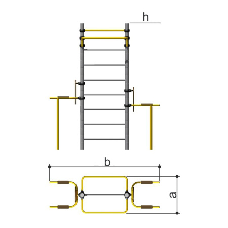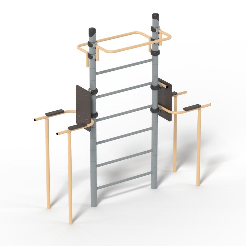 Спортивное оборудование предназначено для установки на территориях игровых зон, зон отдыха, спортивных площадках. Может эксплуатироваться круглогодично. Предназначено для доступных занятий физической культурой на свежем воздухе для пользователей от 7 лет.Представляет собой сборно-разборную прямоугольную конструкцию, состоящую из двух стоек и одной шестиступенчатой шведской стенки. В верхней её части с противоположных сторон должны быть закреплены два рукохода, причем один из них на 150 мм ниже первого рукохода. К стойкам лестницы должны быть закреплены на разной высоте брусья со спинкой и подлокотниками.Изделие устанавливается на открытых уличных участках, находящихся под контролем ответственного лица – эксплуатанта. Установка должна проводится на ровной площадке, свободной от насаждений. В зоне безопасности должно быть ударопоглощающее покрытие (песок, древесные опилки) минимальной толщиной 300 мм.