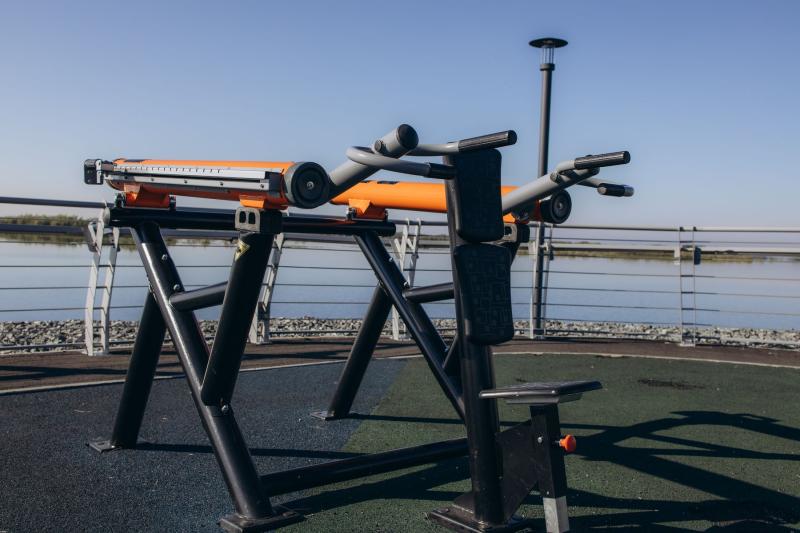 Уличный тренажер для выполнения базового силового упражнения для атлетов «Жим сидя от плеч» или «Армейский жим на плечи».