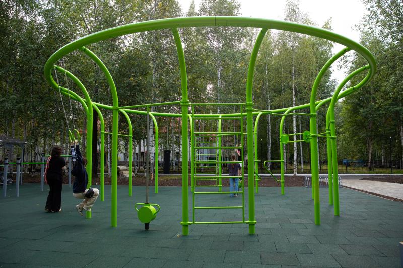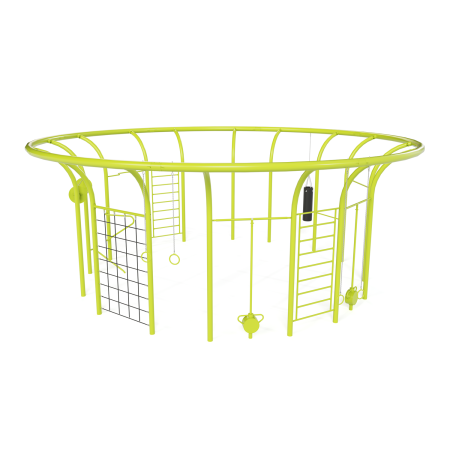 Изделие представляет собой сборную каркасную металлическую конструкцию, к которой закреплены спортивные элементы. Металлический каркас изготовлен из труб круглого сечения с порошковой окраской, матовый финиш, скрытый крепеж. На каркас крепятся канатная сетка, боксёрская груша, гири, кольца, вращающийся турник.