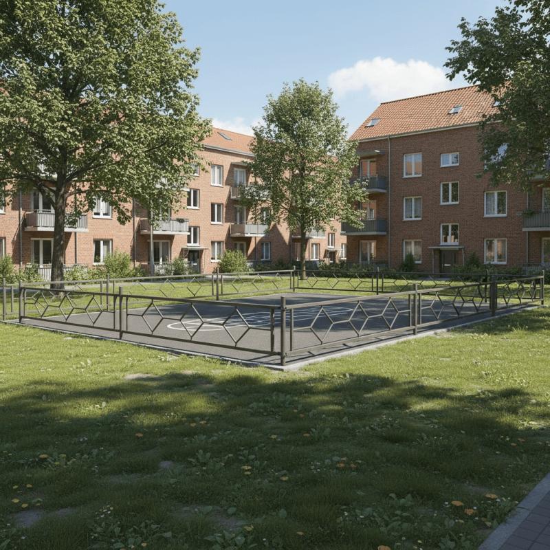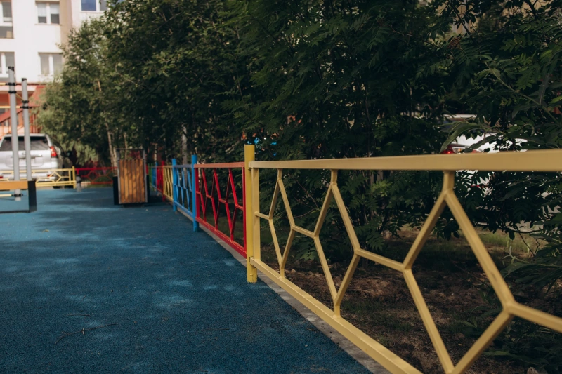 Ограждение металлическое красное с узором в виде трех квадратов для спортивной или детской площадки. Размеры секции 2000 х 500 мм
